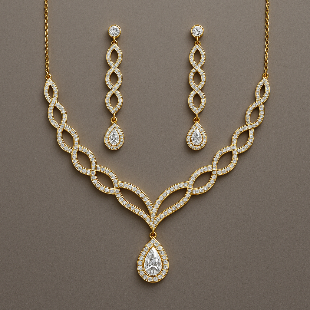 Make every moment sparkle with this stunning Gold-Plated Necklace & Earring Set, exquisitely designed with interlinked curves and dazzling crystal stones. The necklace features a teardrop-shaped central pendant adorned with clear, high-shine crystals, perfectly matched with elegant drop earrings to complete your look. Ideal for weddings, parties, or festive occasions, this set offers timeless beauty and graceful sophistication.